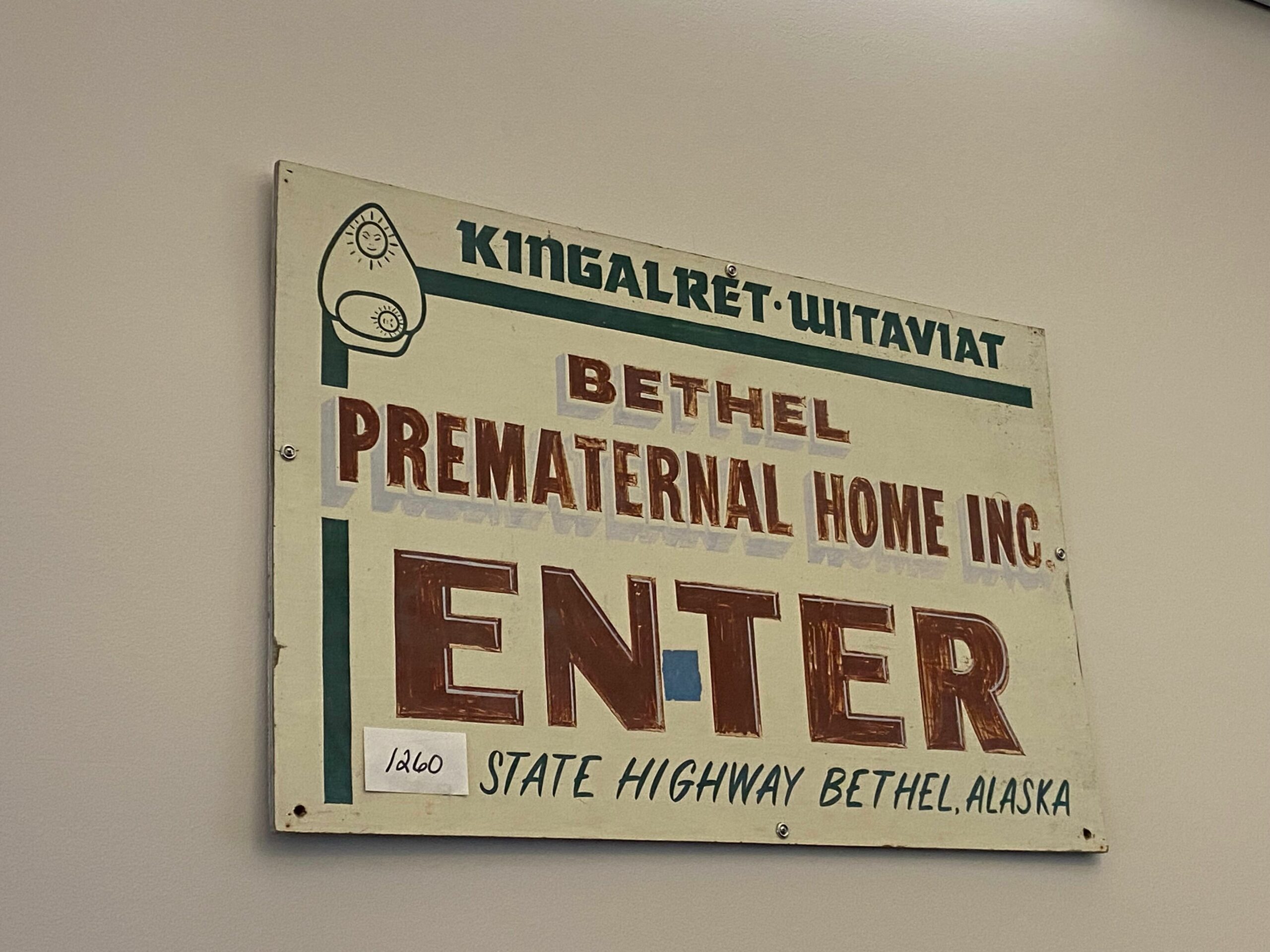 - Original sign for the pre-maternal home at YKHC. The pre-maternal home in Bethel was founded after a pregnant woman from a surrounding village was found taking shelter under an overturned boat, highlighting the need for homes near the hospital for expectant mothers waiting to give birth.