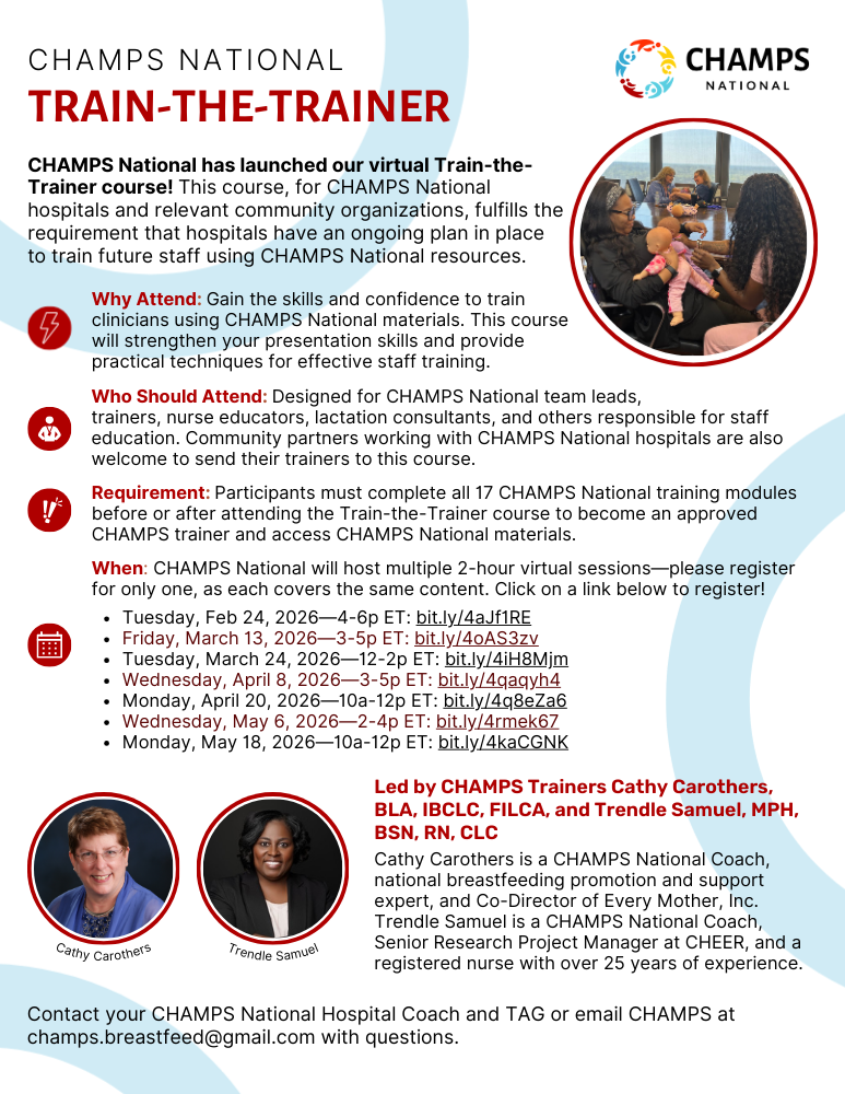 Who Should Attend: Designed for CHAMPS National team leads, trainers, nurse educators, lactation consultants, and others responsible for staff education. Community partners working with CHAMPS National hospitals are also welcome to send their trainers to this course.