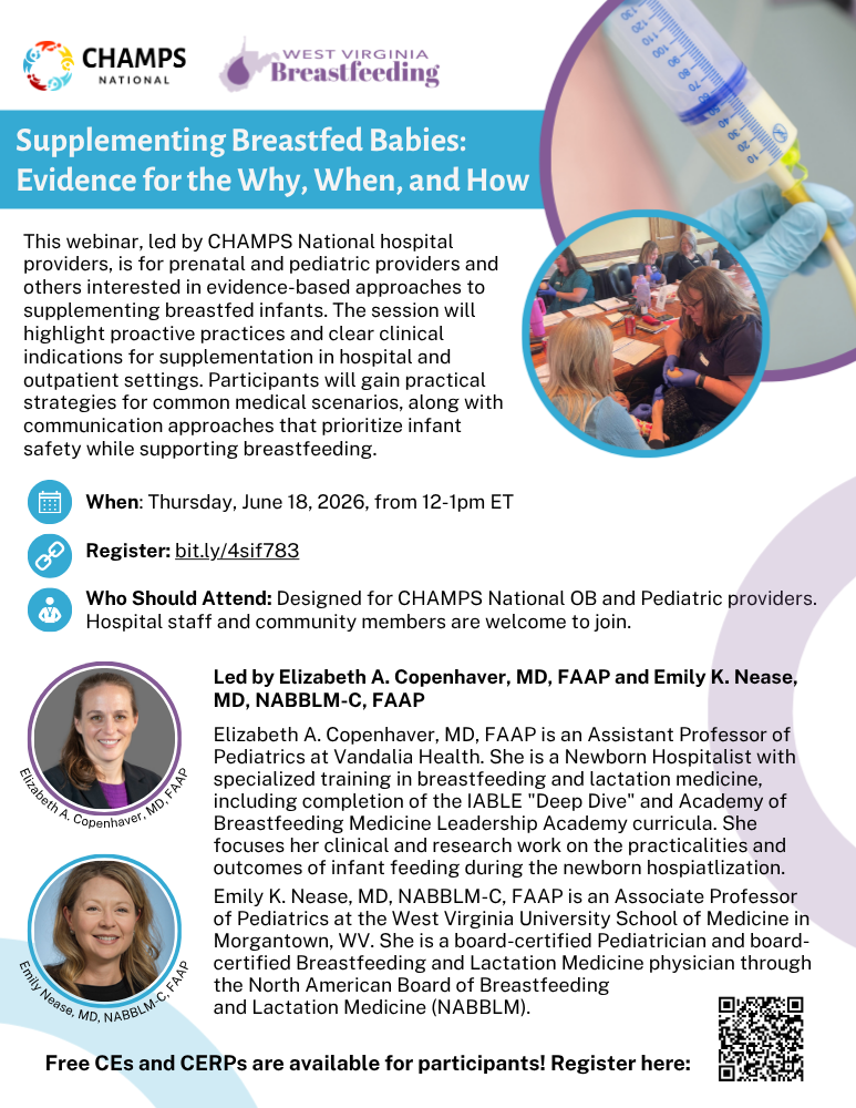 CHAMPS National is teaming up with the West Virginia Breastfeeding for an upcoming provider-led webinar on evidence-based approaches to supplementing breastfed infants. Join Dr. Copenhaver and Dr. Nease as they share: