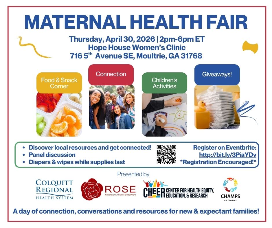 On Thursday, April 30th, the ROSE and the Colquitt Regional Medical Center teams will jointly host a Maternal Health Fair dedicated to new and expectant mothers in Moultrie, Georgia! This Maternal Health Fair will connect mothers with local maternal health resources and provide free infant care supplies, while supplies last. Don’t miss out on this chance to get involved and discover what Moultrie has to offer new and expectant moms! Register here.