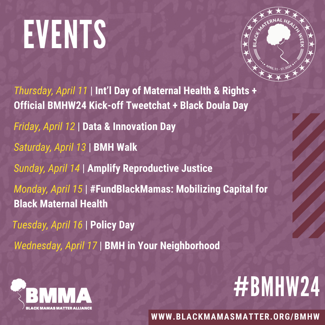 BMHW began on April 11, and activities and conversations will continue through April 17! Learn how you can take part in BMHW here: blackmamasmatter.org/bmhw-2024.