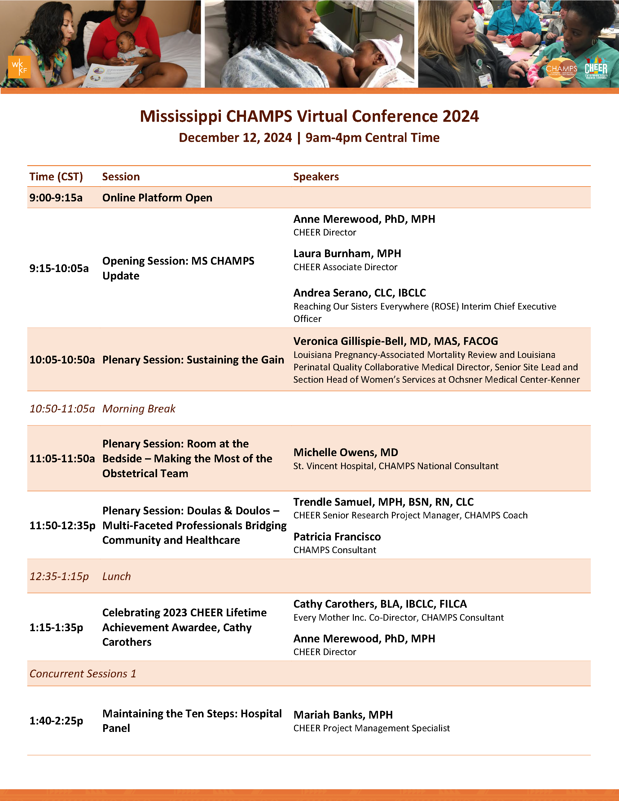 Registration is now open for CHEER’s first-ever virtual conference, CHEERing for CHAMPions! CHEERing for CHAMPions: Virtual Breastfeeding Conference 2021, is free for all attendees. After registering, you will have access to the virtual conference platform, organized by SpotMe. Nursing CE credits available to Mississippi nursing staff at no cost; available to non-MS nursing staff for a requested donation.